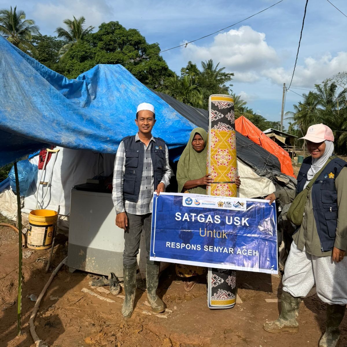“Persoalan utama masyarakat yang tinggal di sekitar tanggul Sungai Arakundo adalah mereka sudah tidak memiliki rumah lagi atau rumahnya masih berair dan berlumpur. Kebutuhan mendesak saat ini adalah alas tidur yang tidak menyerap air. Karena itu, kami menyalurkan alas tidur berukuran 3 x 4 meter yang dapat digunakan bersama dalam satu tenda,” ujar Prof. Muksin.
